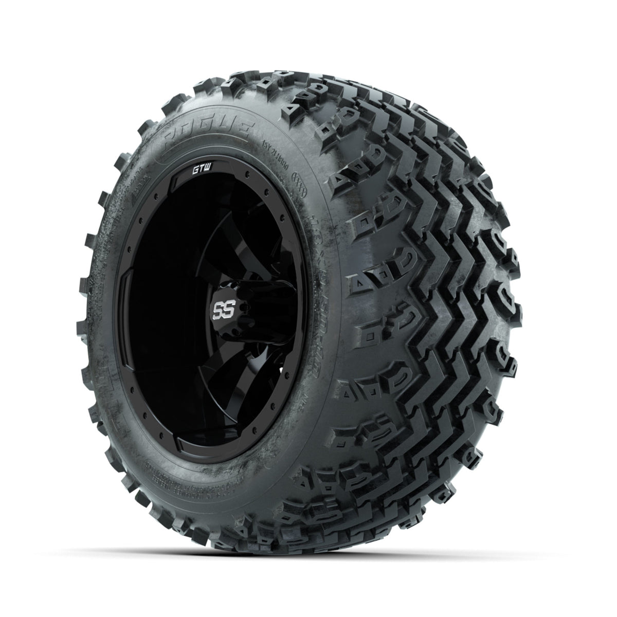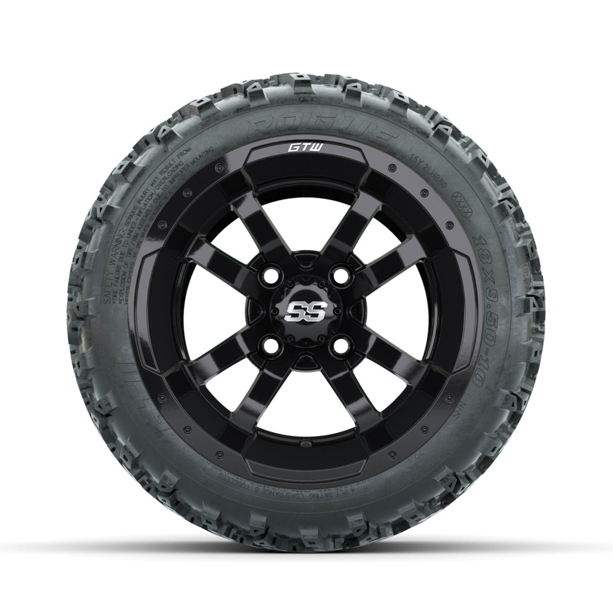 A set of (4) 10-inch GTW® Storm Trooper Black golf cart wheels Mounted on 18x9.50-10 Rogue All-Terrain Tires