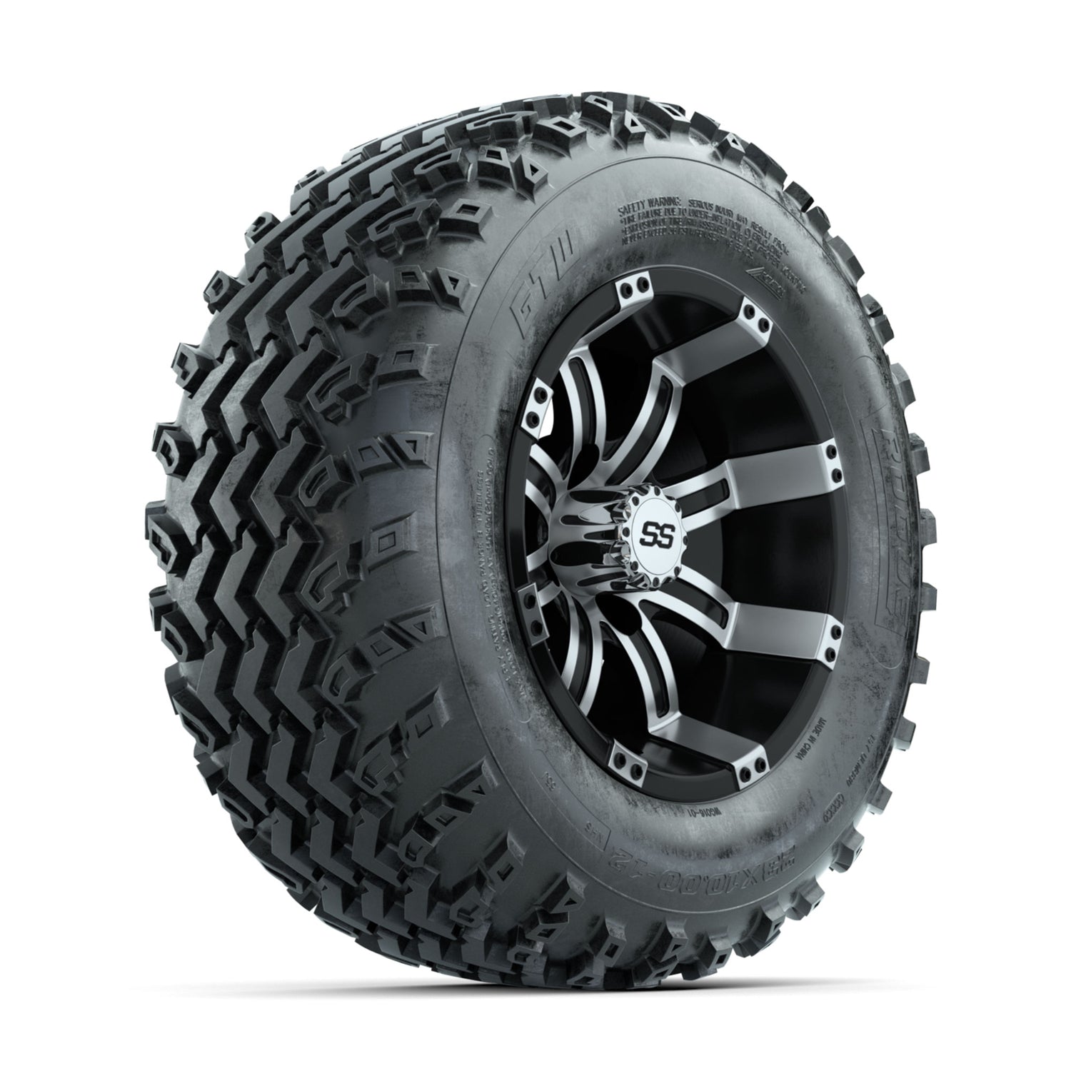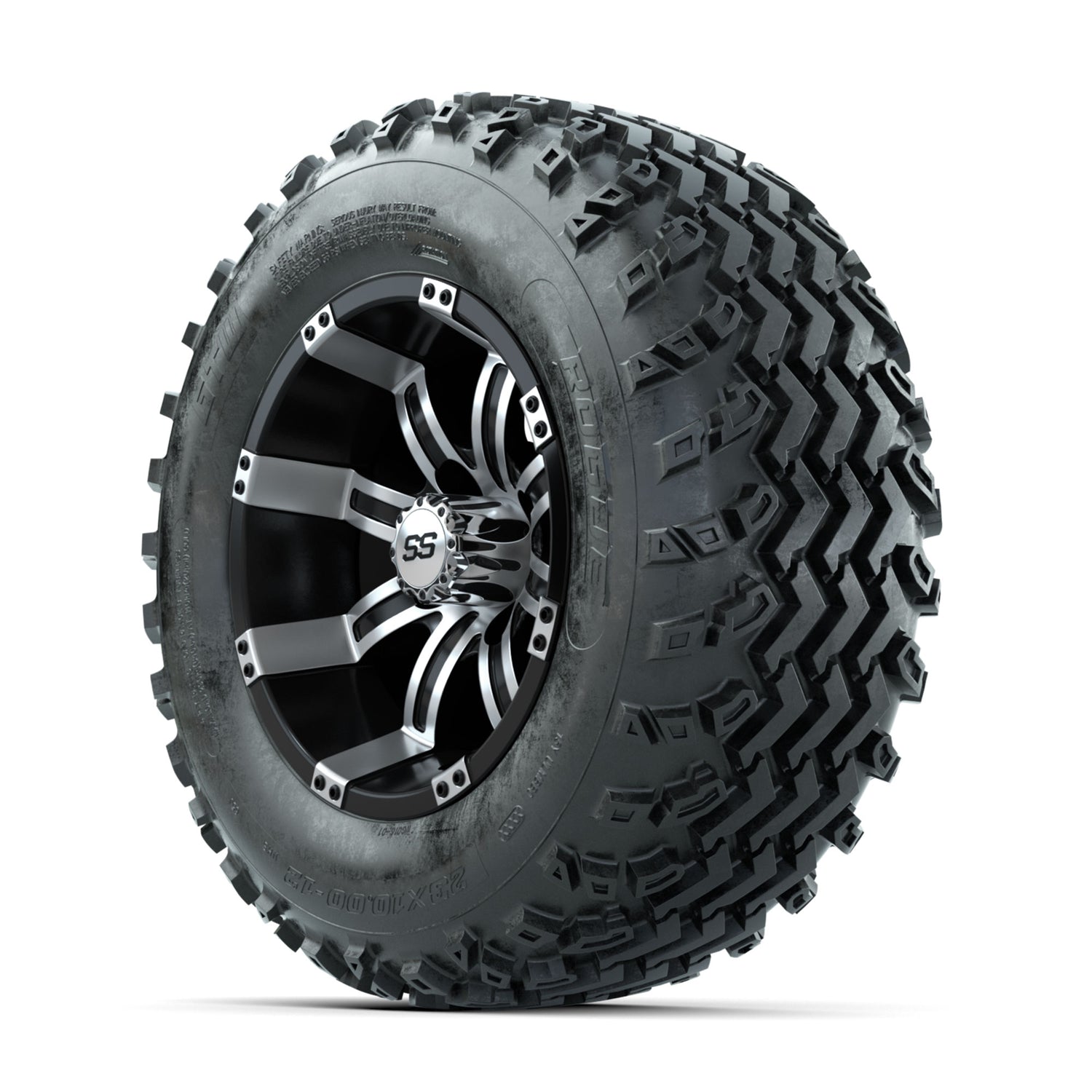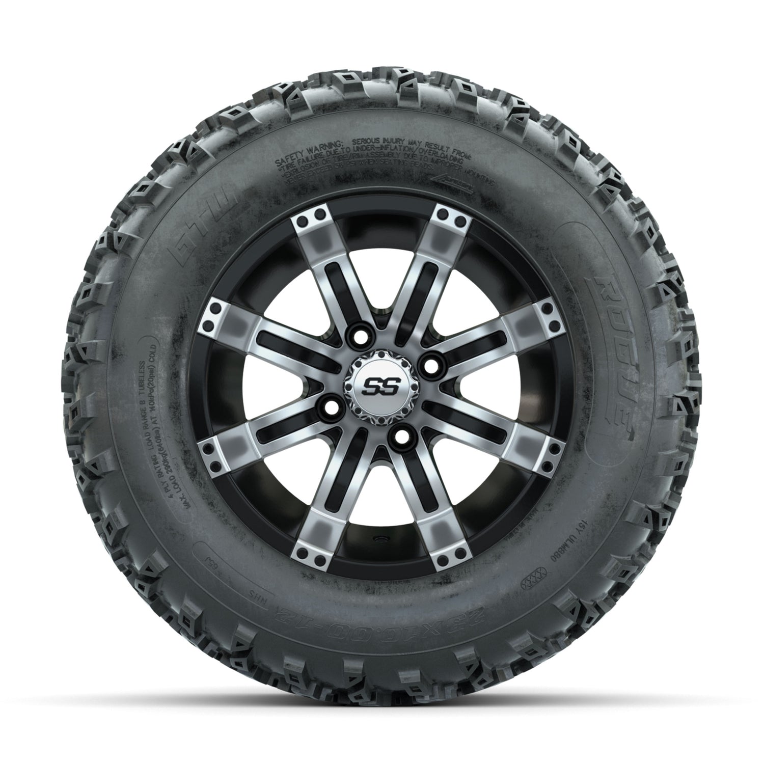 A set of (4) 12-inch GTW® Tempest Machined/Black golf cart wheels Mounted on 23x10.00-12 Rogue All-Terrain Tires