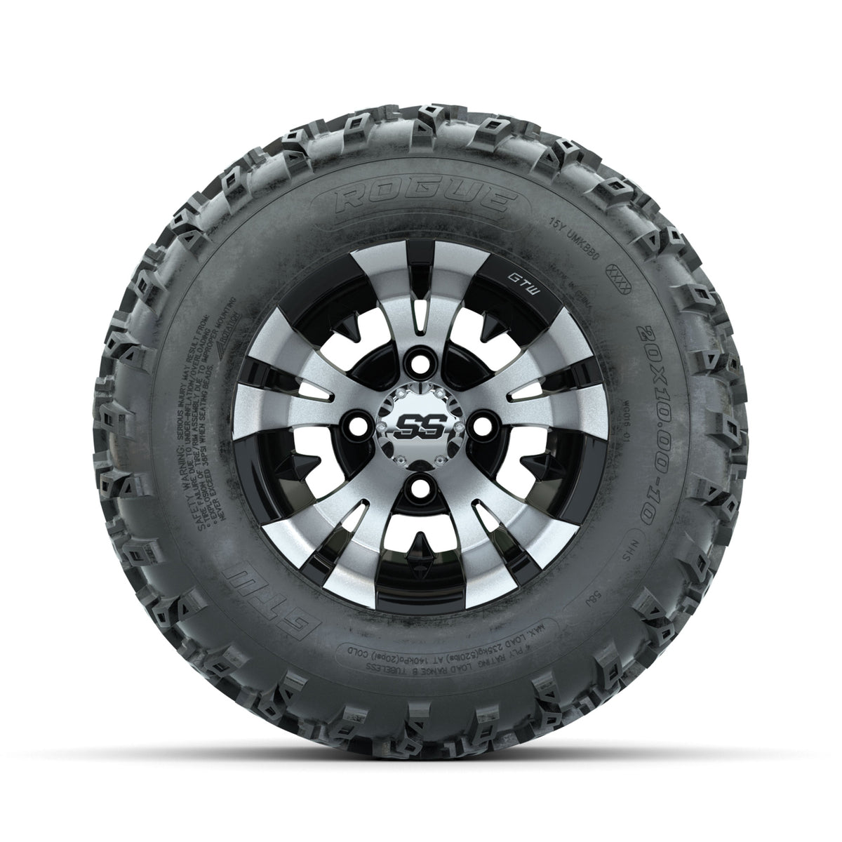 A set of (4) 10-inch GTW® Vampire Machined/Black golf cart wheels Mounted on 20x10.00-10 Rogue All-Terrain Tires