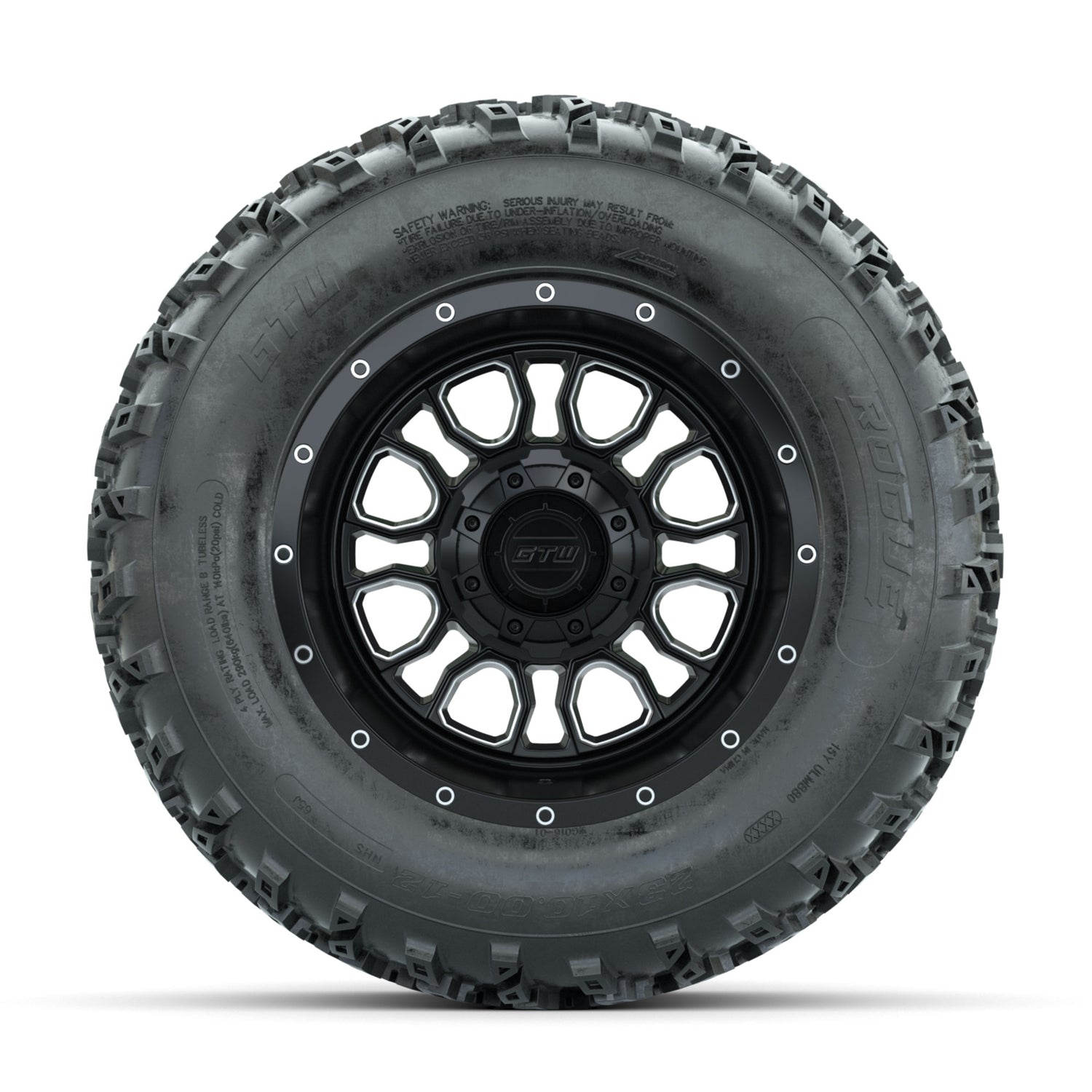 A set of (4) 12-inch GTW® Volt Machined/Black golf cart wheels Mounted on 23x10.00-12 Rogue All-Terrain Tires