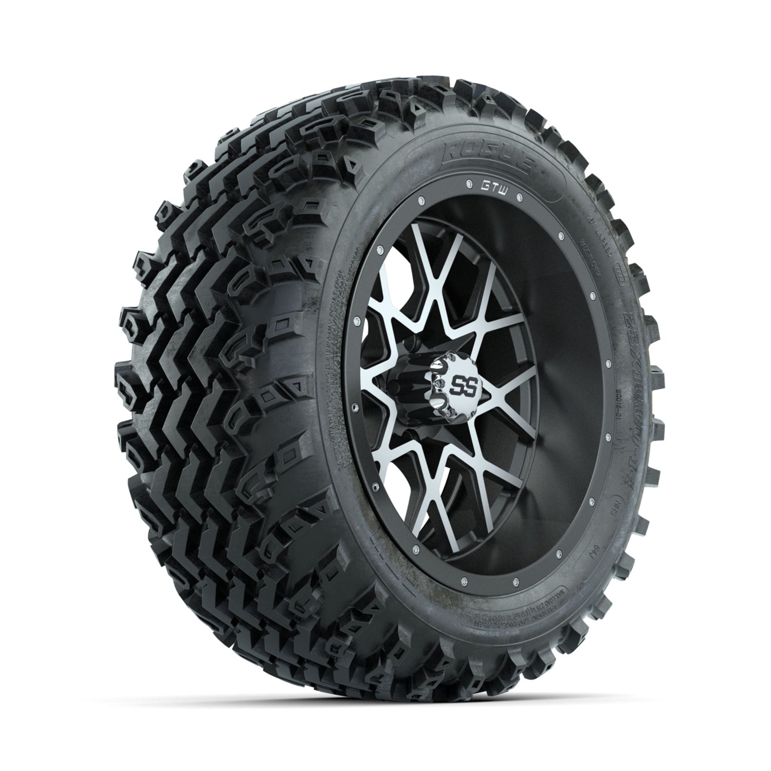 A set of (4) 14-inch GTW® Vortex Machined/Matte Grey golf cart wheels Mounted on 23x10.00-14 Rogue All-Terrain Tires