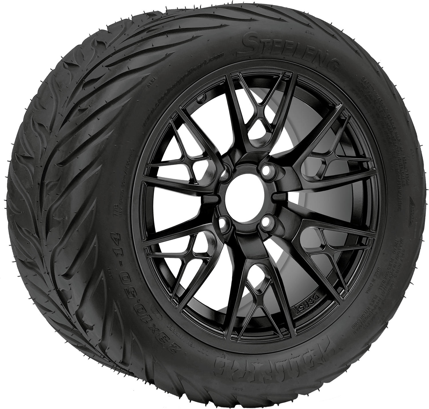 SGC 14 " Saber Tooth Matte Black Wheel - Aluminum Alloy / STEELENG 23 "x10.5 "-14 " HELLFIRE Street Tire DOT Approved Tires Combo - Set of 4